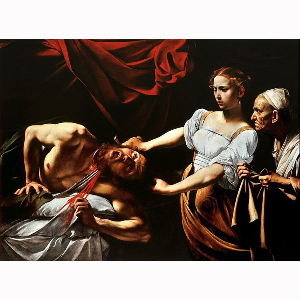 Caravaggio’s approach was, typically, to choose the moment of the greatest dramatic impact: the moment of the decapitation itself. The figures are set out in a shallow stage, theatrically lit from the side, isolated against the inky black background. Judith’s maid Abra stands beside her mistress to the right as Judith extends her arm to hold a blade against Holofernes’s neck; lying on his stomach, neck contorted as he turns his head towards his assassin, he is vulnerable. X-rays have revealed that Caravaggio adjusted the placement of Holofernes’ head as he proceeded, separating it slightly from the torso and moving it minutely to the right. The faces of the three characters demonstrate the artist’s mastery of emotion, Judith’s countenance in particular showing a mix of determination and repulsion. Artemisia Gentileschi and others were deeply influenced by this work; while they even surpassed Caravaggio’s physical realism, it has been argued that none matched his capture of Judith’s psychological ambivalence.