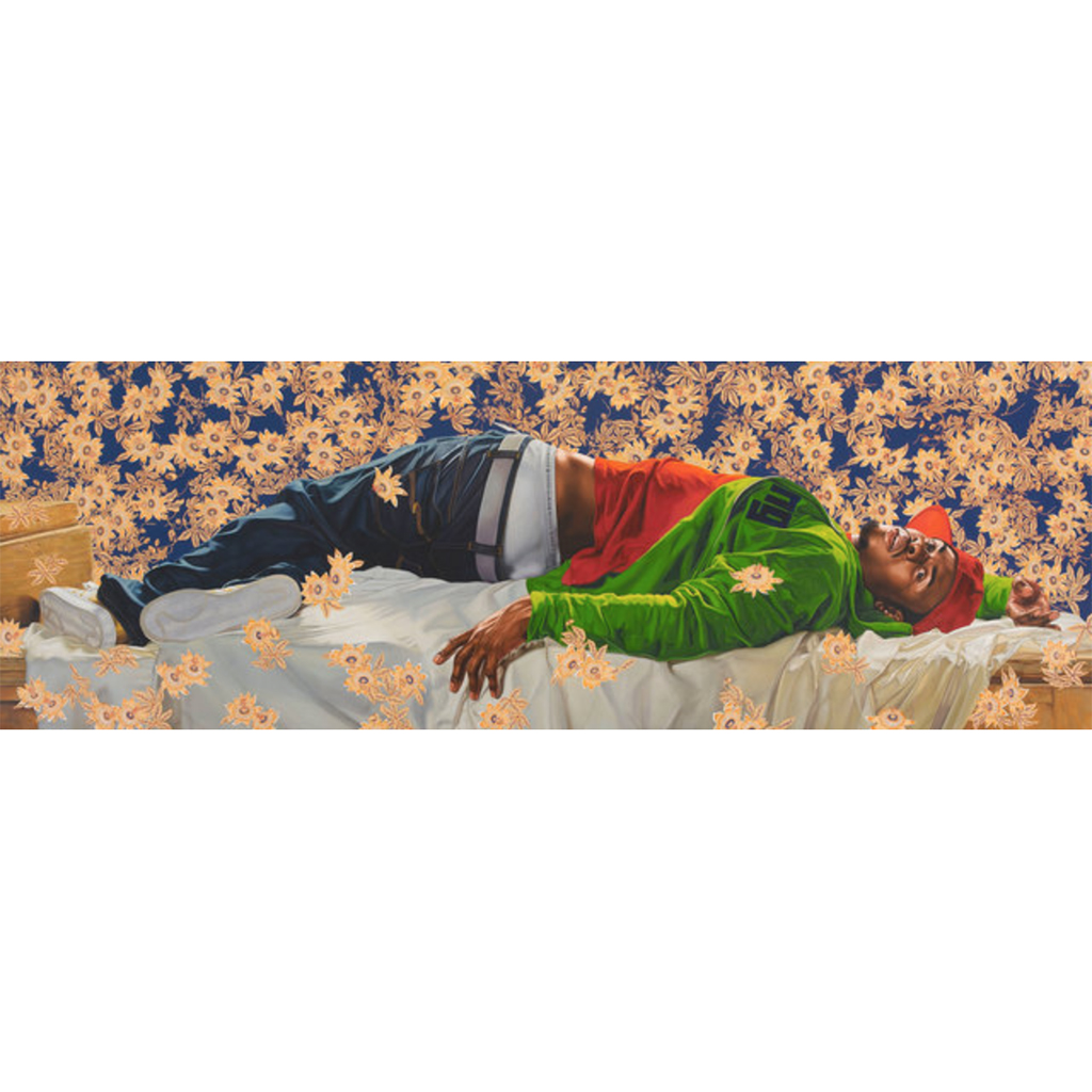 Working exclusively in portraiture, Kehinde Wiley fuses traditional formats and motifs with modern modes of representation. Selecting works from old masters like Peter Paul Rubens or Jacques-Louis David, Wiley replaces the historical figures with handsome young black men. In his related, ongoing “World Stage” series, Wiley’s heroic figures are depicted in front of colorful background patterns that make specific reference to textiles and decorative patterns of various cultures, from 19th-century Judaica paper cutouts to Martha Stewart’s interior color swatches. Wiley’s penchant for jarring juxtapositions stems from his desire to complicate notions of group identity. “How do we…go beyond the media stereotypes about national identity?” he has said. “I don’t really think about myself as a young gay black American, nor do I interface with my Brazilian or Mexican or Jewish friends that way.”