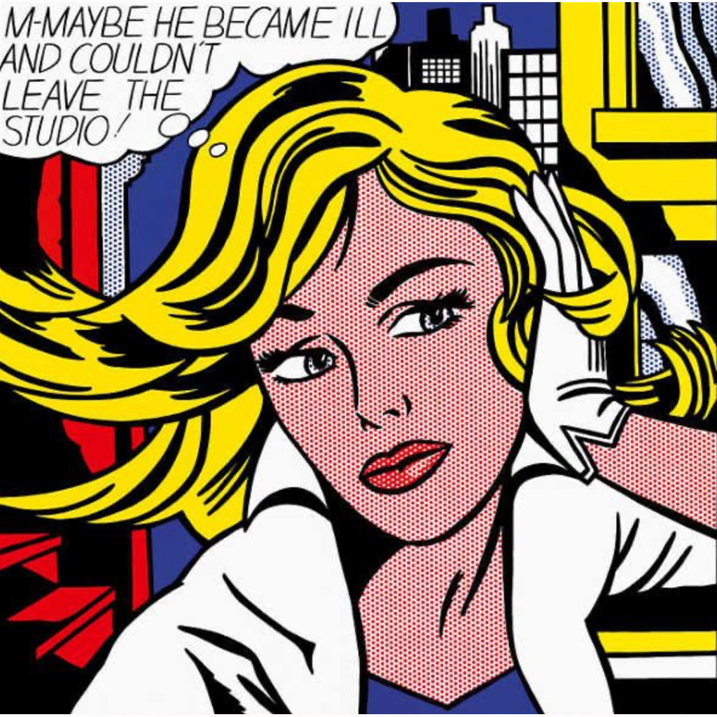 M-Maybe depicts an blonde attractive girl, which is typical of Lichtenstein’s romance comics adaptations. As is a common theme among these works, she awaits a man in a vague but urban setting. The thought bubble reads “M–Maybe he became ill and couldn’t leave the studio”. The text and her expression jointly capture her continuing worry and anticipation. David Britt likens the work to Victorian narrative painting because Lichtenstein invites much speculation with the work, including the identities of the present and absent subjects of the work as well as the “nature of the situation”. I.e, what might be holding up his arrival.