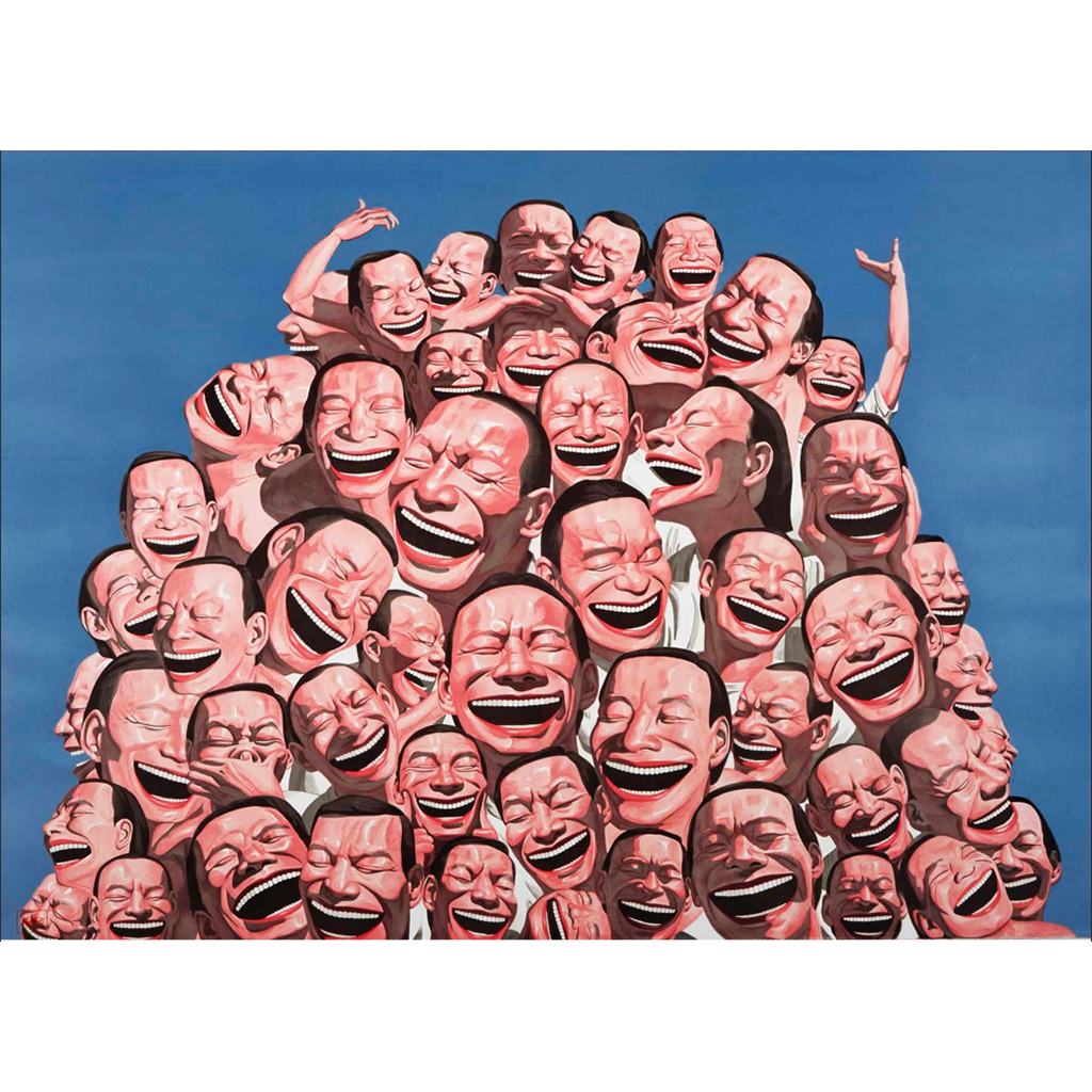 Yue Minjun’s works are instantly recognizable by the characteristic laughing figure, actually, the artist himself, depicted in various guises in virtually all his works. The figure has more teeth than one could possibly want, like the expensive smiles of fashion models advertising the latest whitening power of a toothpaste brand. This figure also shares the exaggerated nature of these advertising images. Yue Minjun’s trademark smile is many things at once. It is hilarious and infectious yet cynical and mocking. It appears superficial, mindless, even ridiculous but is deeply revealing and compelling. There are instant parallels to be drawn with the Social Realist propaganda posters of earlier eras of communism.
