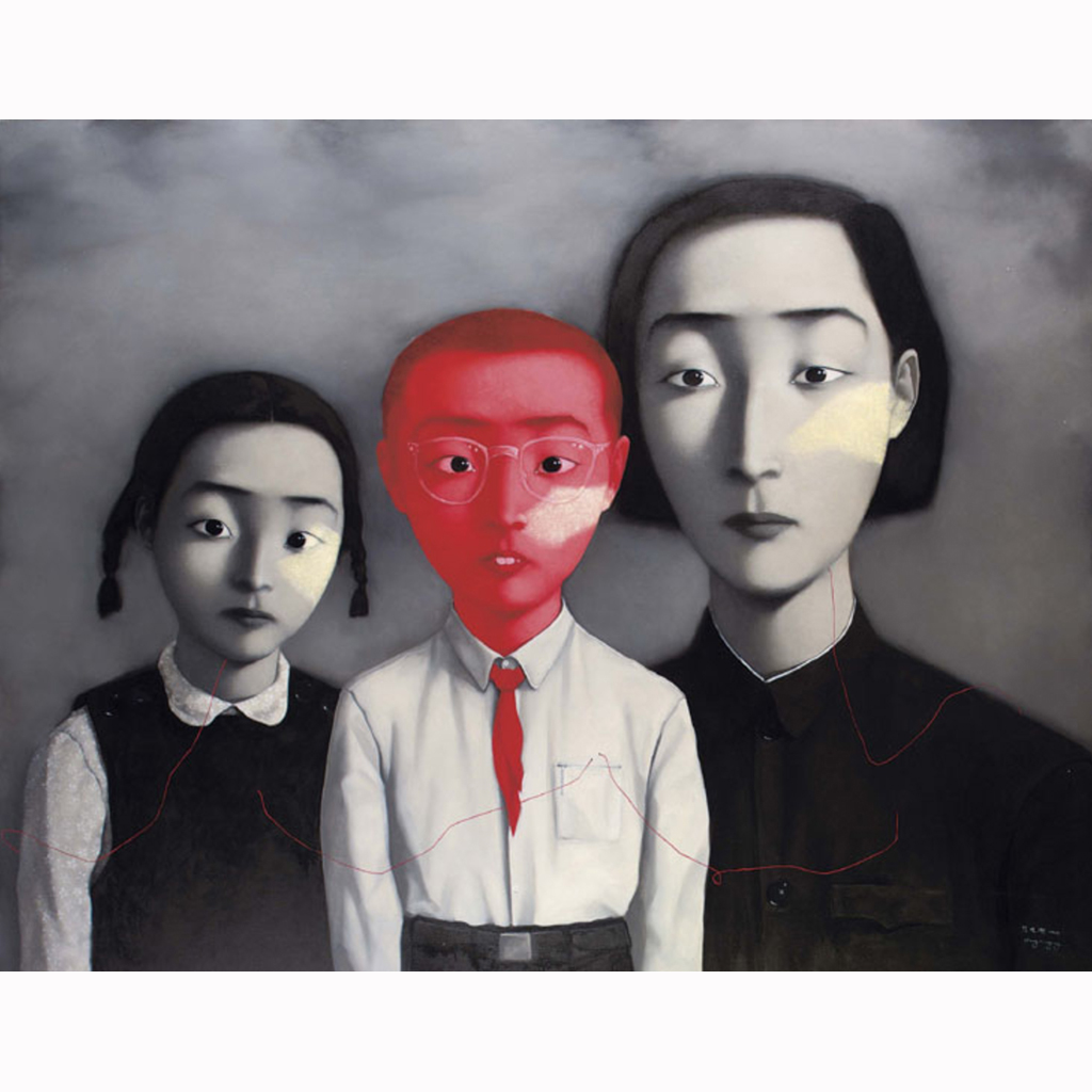Inspired by family photos from the Cultural Revolution period, as well as the European tradition of surrealism, Zhang Xiaogang’s paintings engage with the notion of identity within the Chinese culture of collectivism. Basing his work around the concept of ‘family’ –immediate, extended, and societal – Xiaogang’s portraits depict an endless genealogy of imagined forebears and progenitors, each unnervingly similar and distinguished by minute difference.
